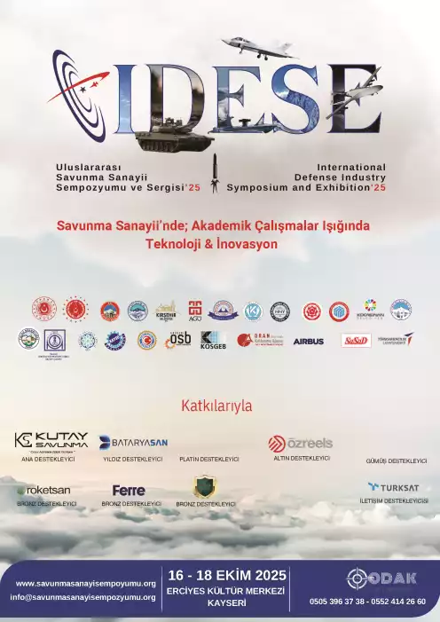 16-18 Ekim 2025 tarihleri aralığında Erciyes Kültür Merkezinde ULUSLARARASI SAVUNMA SANAYİİ SEMPOZYUMU ve SERGİSİ'25 düzenlenecektir.